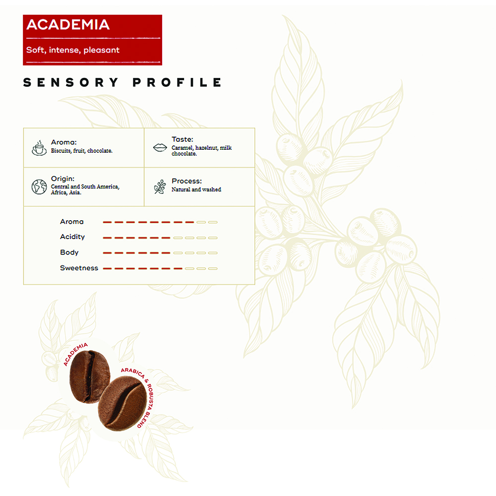 Academia is a unique blend of Arabica and Robusta coffee, ideal for elevating the gastronomic experience linked to the world of pastry. With an origin among the lands of Central and South America, Africa and Asia, Academia selection is the result of quality and excellence, essential elements for Hausbrandt. The production process, between natural and washed methods, gives the coffee an Enveloping aroma of biscuits, fresh fruit and chocolate, while the flavour reveals clear notes of caramel, hazelnut and milk chocolate.