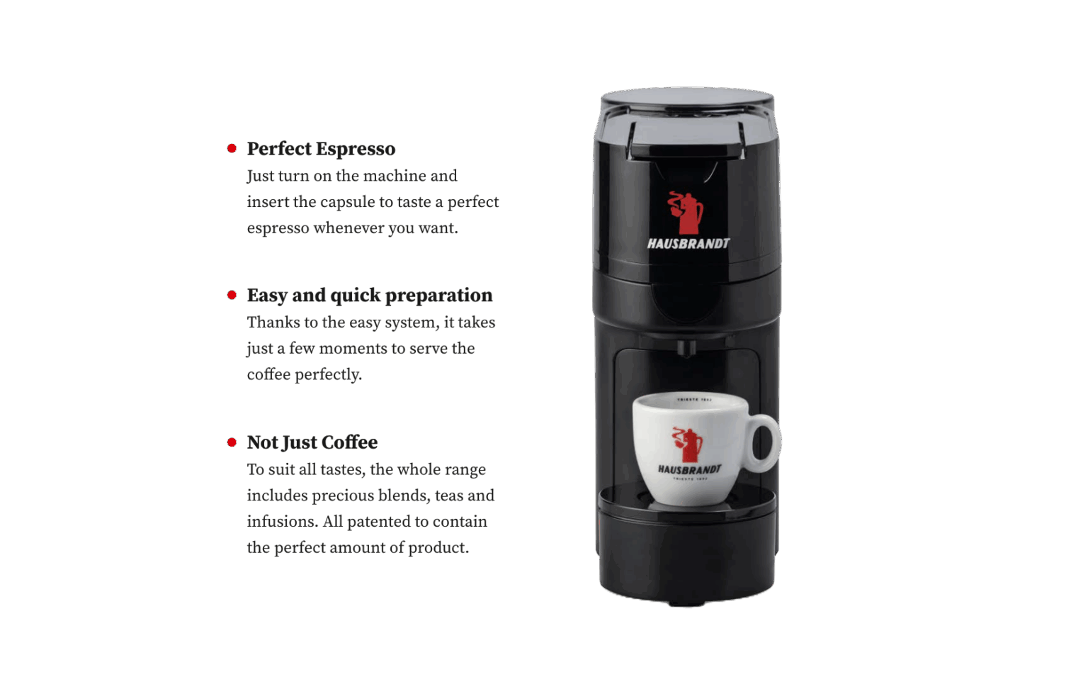 Simply turn on the machine and insert the capsule to always have a state-of-the-art espresso, without the possibility of error.