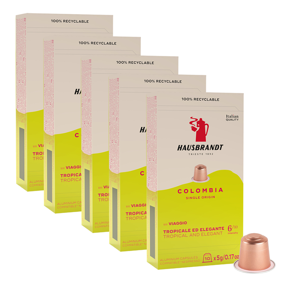 Pack of 5 boxes of 10 capsules of 5 g each of coffee.